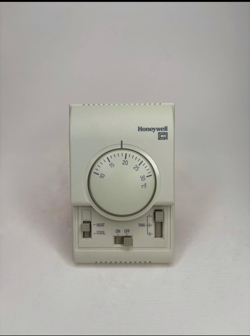 ترموستات دیواری هانیول T6373B1239 با قابلیت کنترل فن‌کویل دو لوله‌ای و تنظیم سه سرعت فن، تغییر حالت گرمایش/سرمایش، تنظیم دمای 10 تا 30 درجه سانتی گراد، با طراحی شیک و نصب آسان مناسب برای سیستم‌های تهویه مطبوع، فن کوئل و مدیریت بهینه دمای محیط.